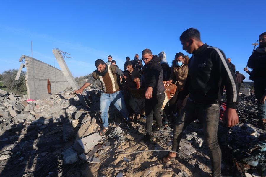 Rescue work is underway after Israeli attacks in the southern Gaza Strip city of Rafah, Jan. 7, 2024. (Photo by Khaled Omar/Xinhua)