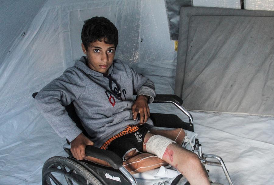 Akram Harb sits in a shelter in Gaza City, Dec. 13, 2024. Harb, a 13-year-old Palestinian, was injured in an Israeli attack at his house in the Jabalia refugee camp in the northern Gaza Strip in October, 2024. (Photo by Mahmoud Zaki/Xinhua)