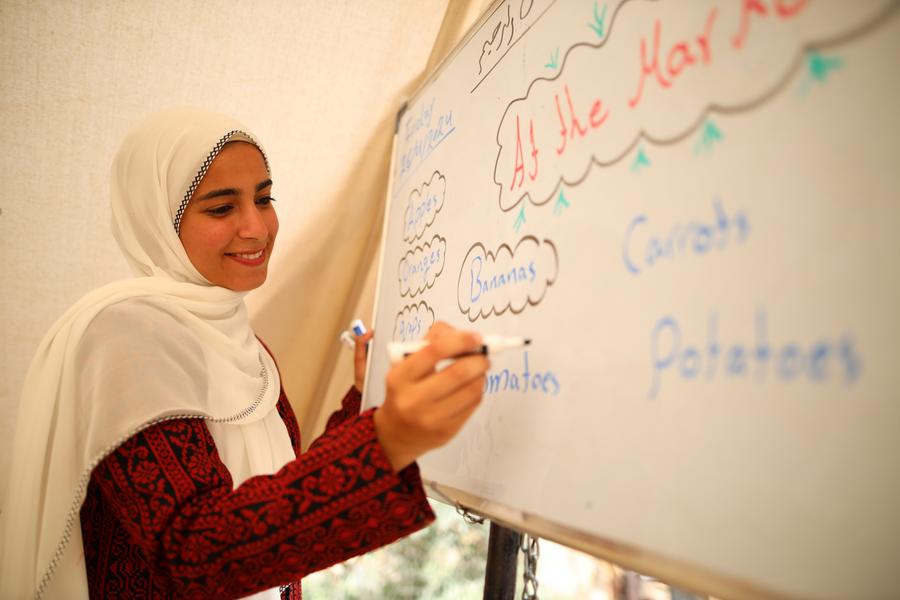 A teacher gives a lesson at a temporary classroom in central Gaza Strip city of Deir el-Balah, April 26, 2024. (Xinhua)