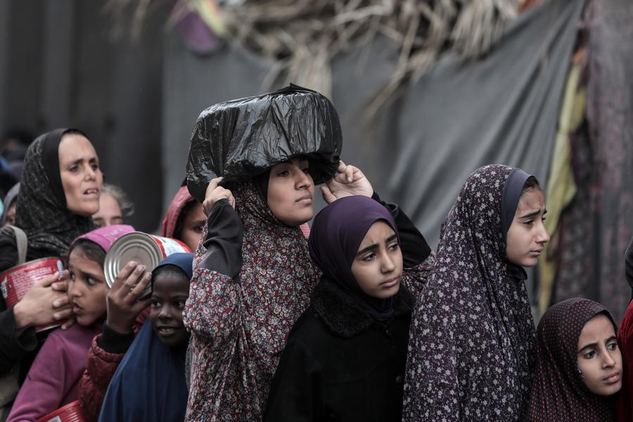 People line up to receive food relief at a food distribution center in the city of Deir al-Balah, central Gaza Strip, Dec. 20, 2024. (Photo by Rizek Abdeljawad/Xinhua)