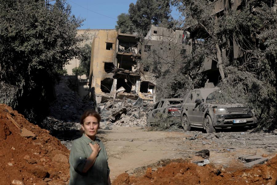 A woman is pictured in front of a damaged building after Israeli airstrikes in the southern suburb of Beirut, Lebanon, Sept. 29, 2024. (Xinhua/Bilal Jawich)
