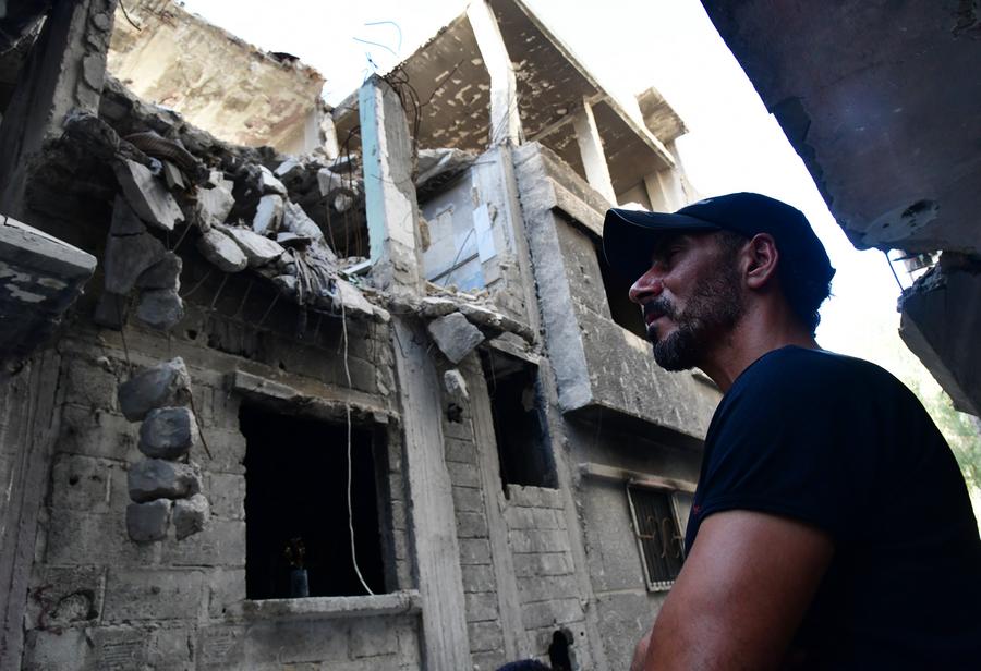 Mohammed Al-Aqad looks at his war-damaged apartment at the Yarmouk camp in Damascus, Syria, June 19, 2024. (Photo by Ammar Safarjalani/Xinhua)