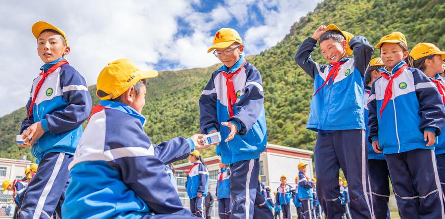 Students line up to get milk at the Central Primary School in Nyangpo Township of Gongbo'Gyamda County, Nyingchi, southwest China's Xizang Autonomous Region, Sept. 4, 2024. (Xinhua/Tenzin Nyida)
