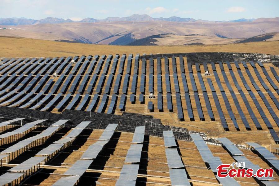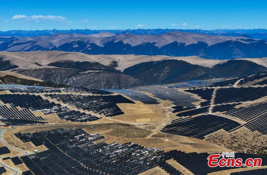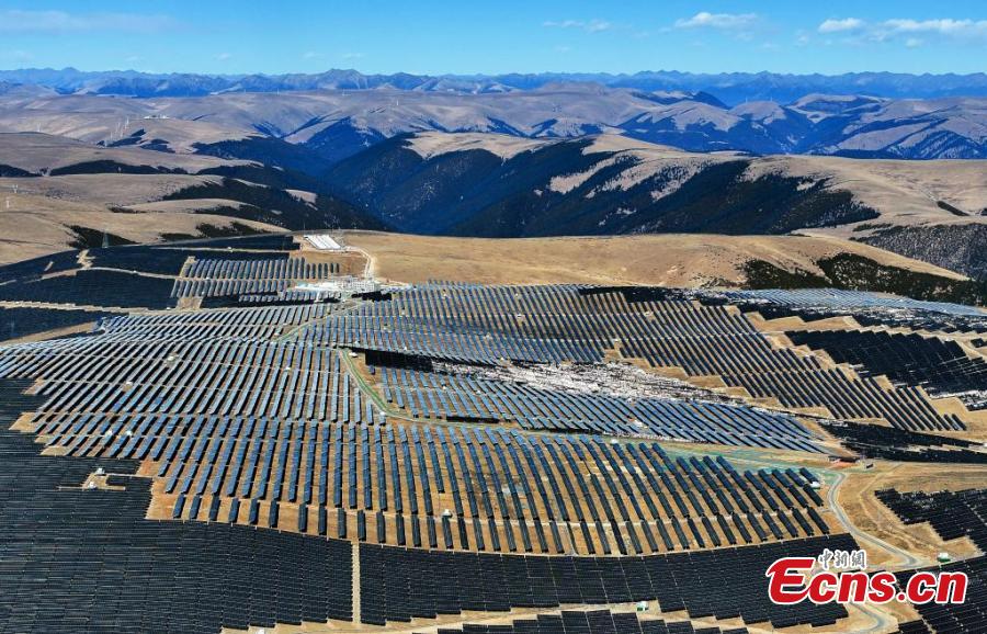 Aerial view of the first phase of the Kela Photovoltaic Power Station, the world's biggest and highest power station that uses both water and light to generate energy, Kela Township of Yajiang County, Garze Tibetan Autonomous Prefecture, southwest China's Sichuan Province, Dec. 23, 2024. (China News Service/Xue Di)