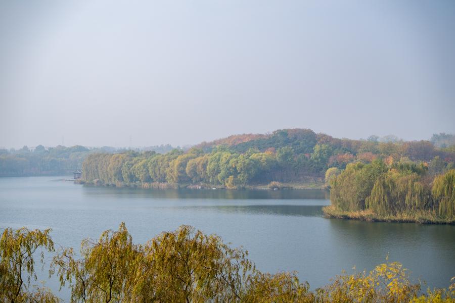 An aerial drone photo taken on Nov. 5, 2024 shows Tianhe Park along the main canal of China's South-to-North Water Diversion Project in Jiaozuo, central China's Henan Province. (Xinhua/Hao Yuan)