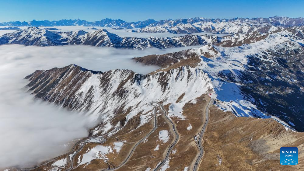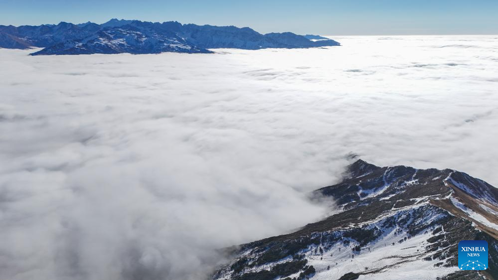 An aerial panoramic photo taken on Dec. 25, 2024 shows the cloud-shrouded Jiajin Mountain in Xiaojin County, Aba Tibetan and Qiang Autonomous Prefecture, southwest China's Sichuan Province. (Xinhua/Wang Xi)