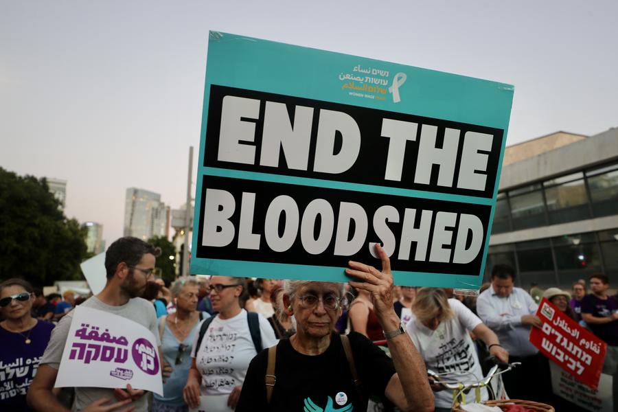 People take part in a demonstration in demand of an immediate ceasefire in Gaza and a deal for the release of the remaining hostages held by Hamas in Tel Aviv, Israel, on July 25, 2024. (Photo by Jamal Awad/Xinhua)