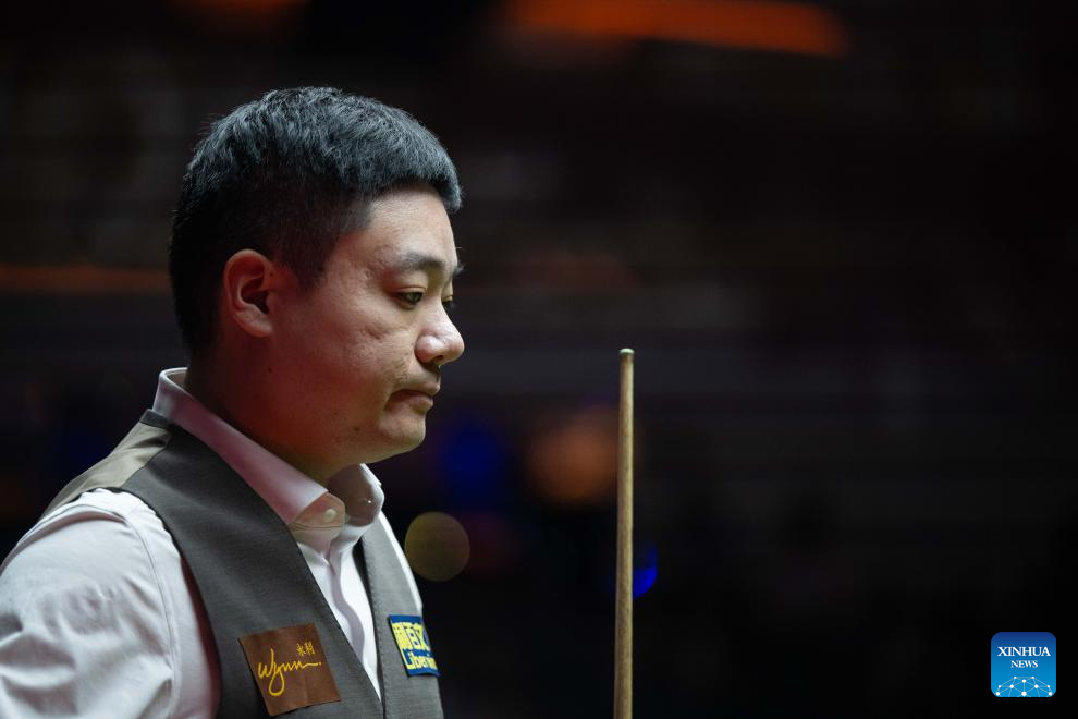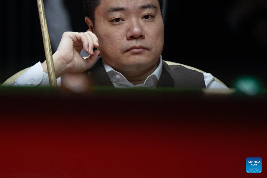 Ding Junhui of China reacts during the match against Judd Trump of England at 2024 Macao Snooker Masters in south China's Macao, Dec. 25, 2024. (Xinhua/Cheong Kam Ka)