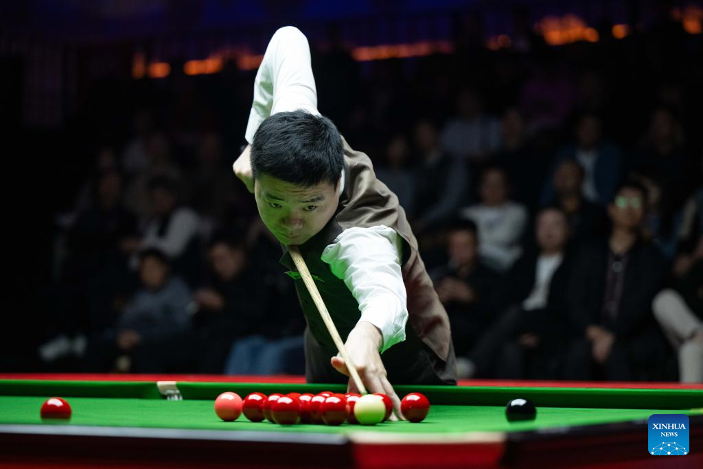 Ding Junhui of China plays a shot during the match against Judd Trump of England at 2024 Macao Snooker Masters in south China's Macao, Dec. 25, 2024. (Xinhua/Cheong Kam Ka)