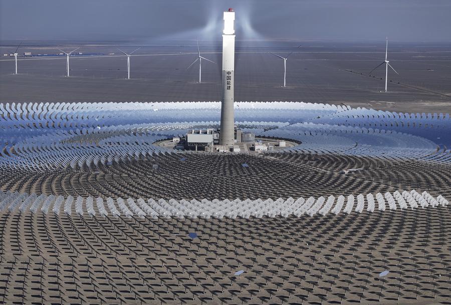 An aerial drone photo taken on Sept. 12, 2024 shows a partial view of a 50-megawatt molten-salt solar thermal power plant in Naomaohu Township of Hami City, northwest China's Xinjiang Uygur Autonomous Region. (Xinhua/Hu Huhu)