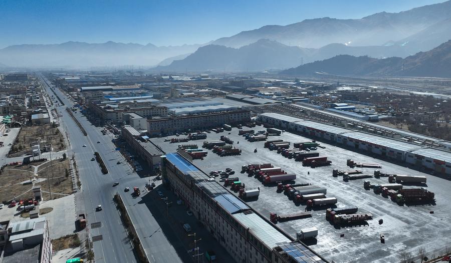 An aerial drone photo taken on Dec. 4, 2024 shows a section of the Qinghai-Xizang Highway and a logistics park located beside it in Doilungdeqen District of Lhasa, southwest China's Xizang Autonomous Region. (Xinhua/Zhang Long)