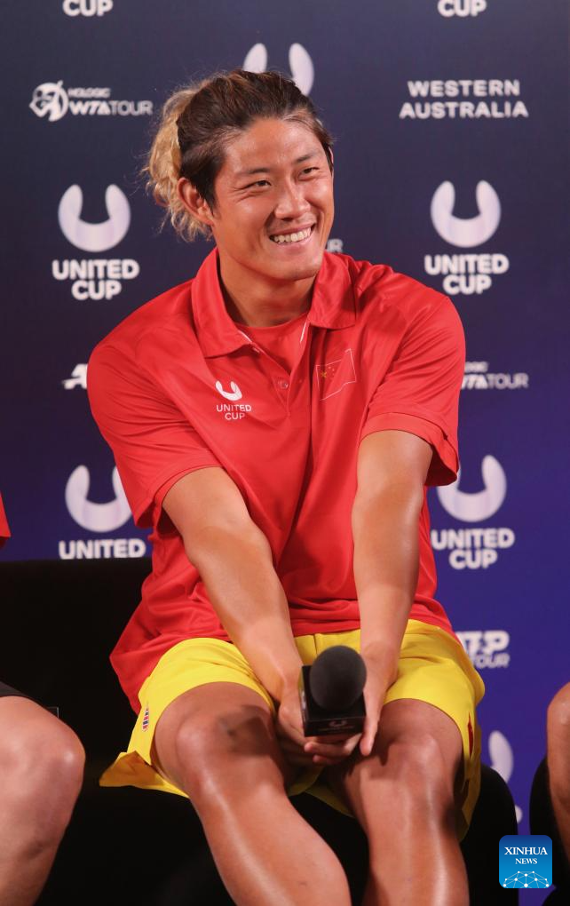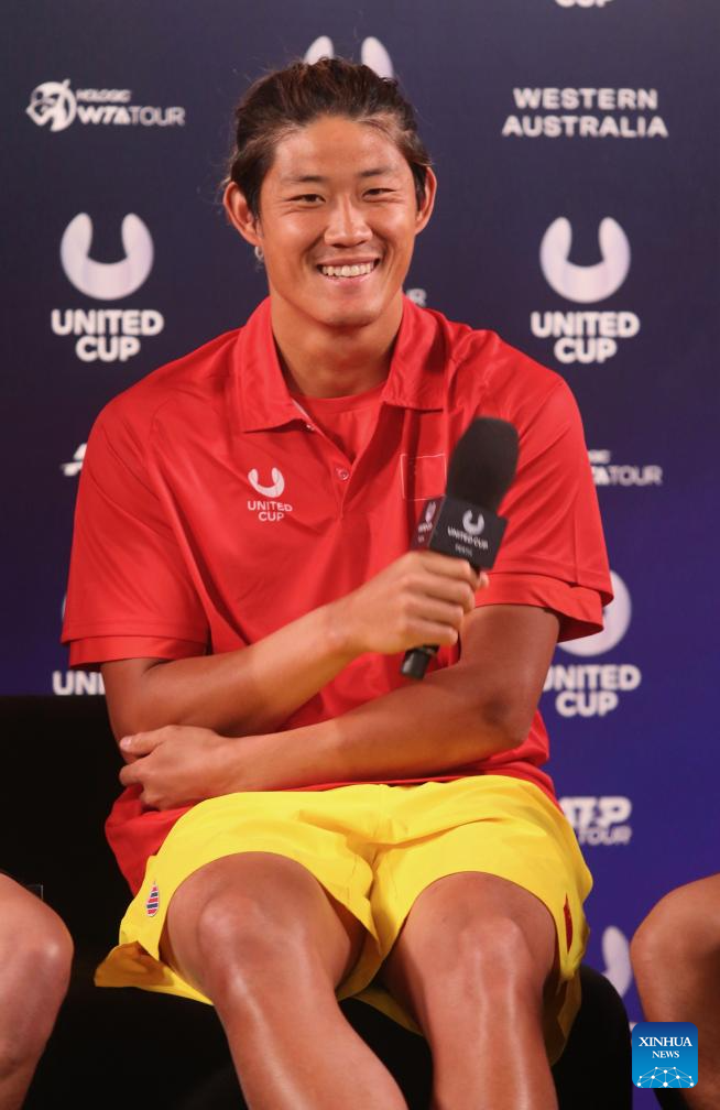 Zhang Zhizhen of China reacts during the media conference of the United Cup Perth at RAC Arena in Perth, Australia, Dec. 26, 2024. (Photo by Zhou Dan/Xinhua)