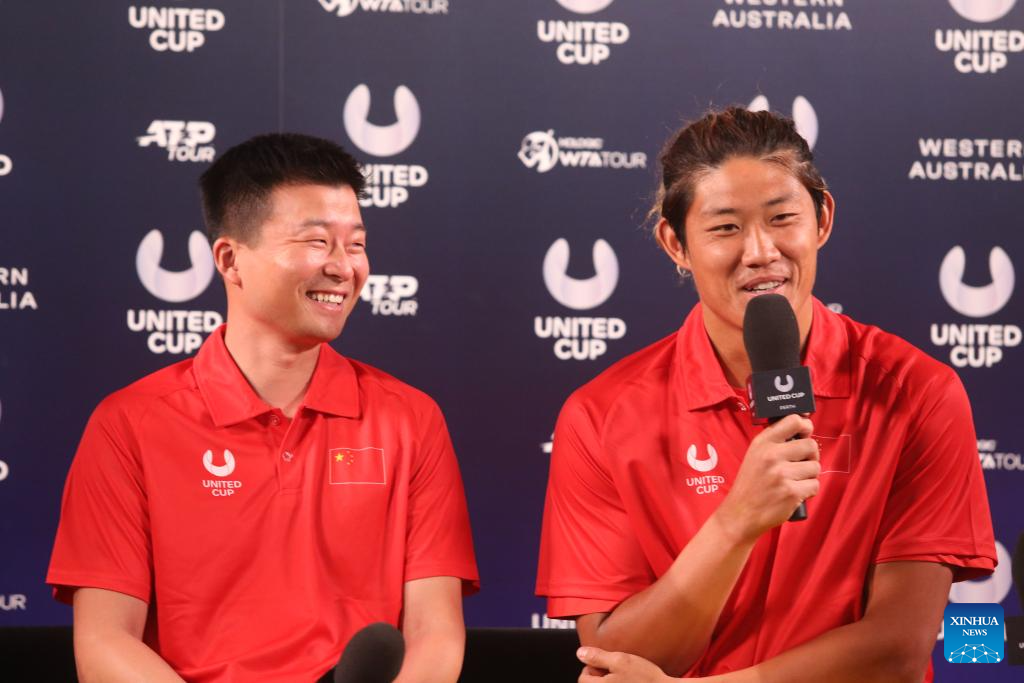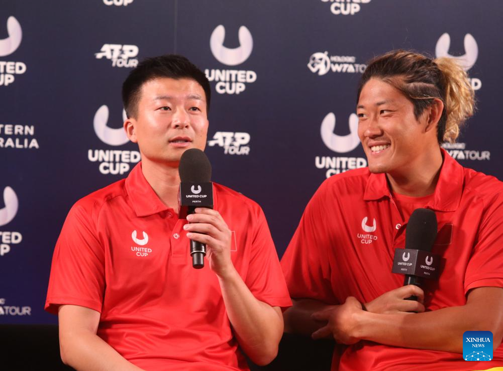 Wu Di (L) of China speaks during the media conference of the United Cup Perth at RAC Arena in Perth, Australia, Dec. 26, 2024. (Photo by Zhou Dan/Xinhua)