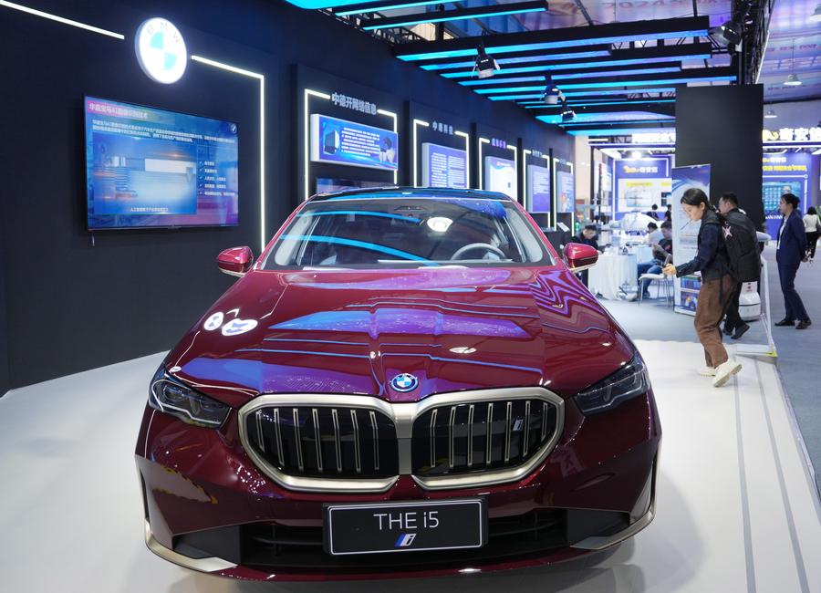 A BMW i5 electric car produced by BMW Brilliance Automotive (BBA) is displayed at an innovation achievements exhibition of the 2024 Global Industrial Internet Conference in Shenyang, northeast China's Liaoning Province, Sept. 12, 2024. (Xinhua/Zhang Lei)
