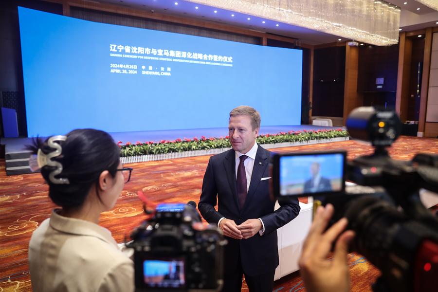 Oliver Zipse, chairman of the Board of Management of BMW AG, speaks during an interview in Shenyang, northeast China's Liaoning Province, April 26, 2024. (Xinhua/Pan Yulong)