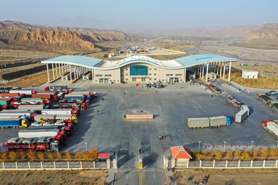 This aerial photo taken on Nov. 8, 2023 shows the Torugart port of northwest China's Xinjiang Uygur Autonomous Region. (Xinhua/Ding Lei)