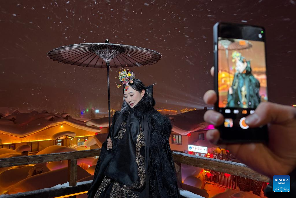A tourist poses for photos at a snow town scenic area in Hailin City, northeast China's Heilongjiang Province, Dec. 28, 2024. Located in Hailin City of Heilongjiang Province, the scenic area has seen a peak of tourism recently with the average number of daily visitors exceeding 20,000. (Xinhua/Yang Siqi)