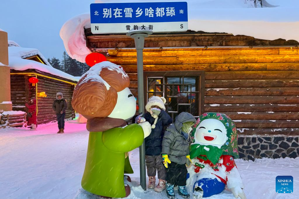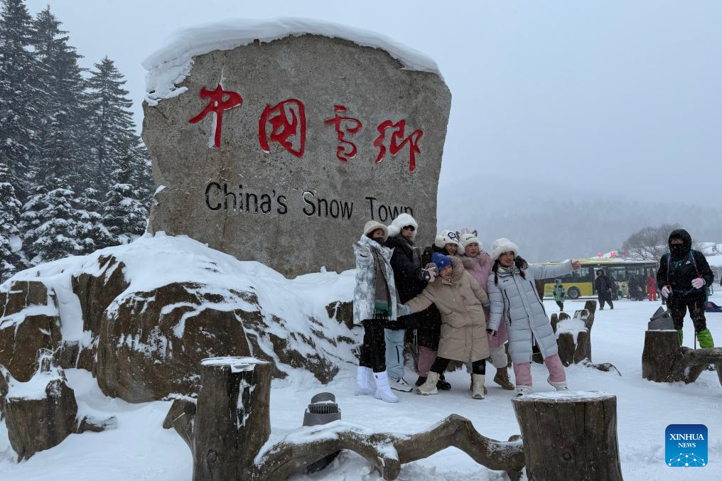 Tourists pose for photos near the sign of a snow town scenic area in Hailin City, northeast China's Heilongjiang Province, Dec. 28, 2024. Located in Hailin City of Heilongjiang Province, the scenic area has seen a peak of tourism recently with the average number of daily visitors exceeding 20,000. (Xinhua/Yang Siqi)