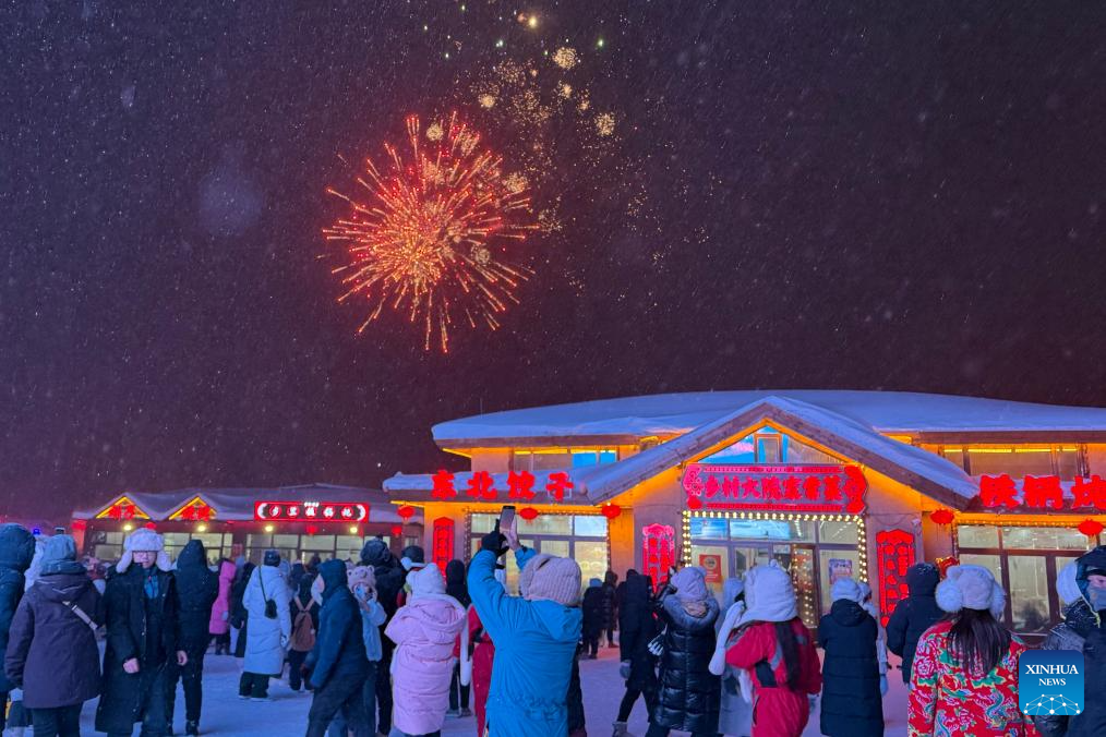 Fireworks are pictured at a snow town scenic area in Hailin City, northeast China's Heilongjiang Province, Dec. 28, 2024. Located in Hailin City of Heilongjiang Province, the scenic area has seen a peak of tourism recently with the average number of daily visitors exceeding 20,000. (Xinhua/Yang Siqi)