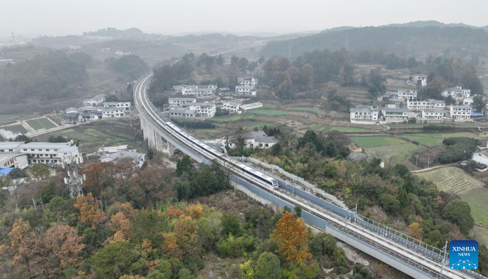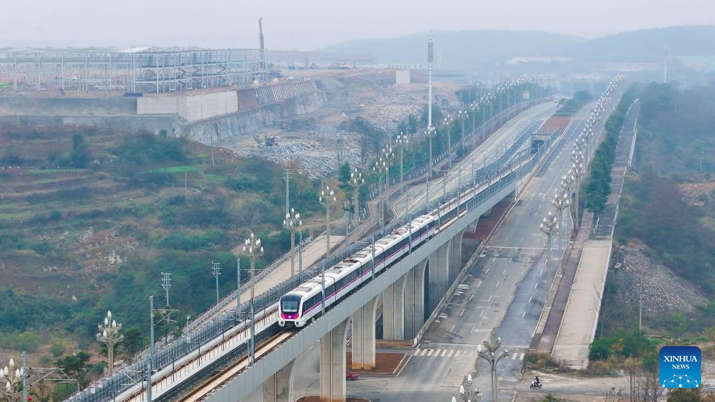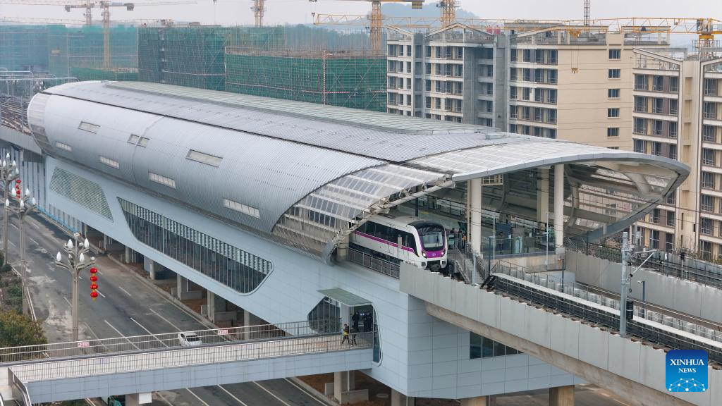 A drone photo shows a train of S1 line departing from Dalongjing station in Guiyang, southwest China's Guizhou Province, Dec. 28, 2024. Guiyang rail S1 line started operation on Saturday. The first phase of S1 line project has a total length of about 30 kilometers and 13 stations, and will become an important passage from Gui'an New Area to the urban area of Guiyang. (Photo by Long Jianrui/Xinhua)