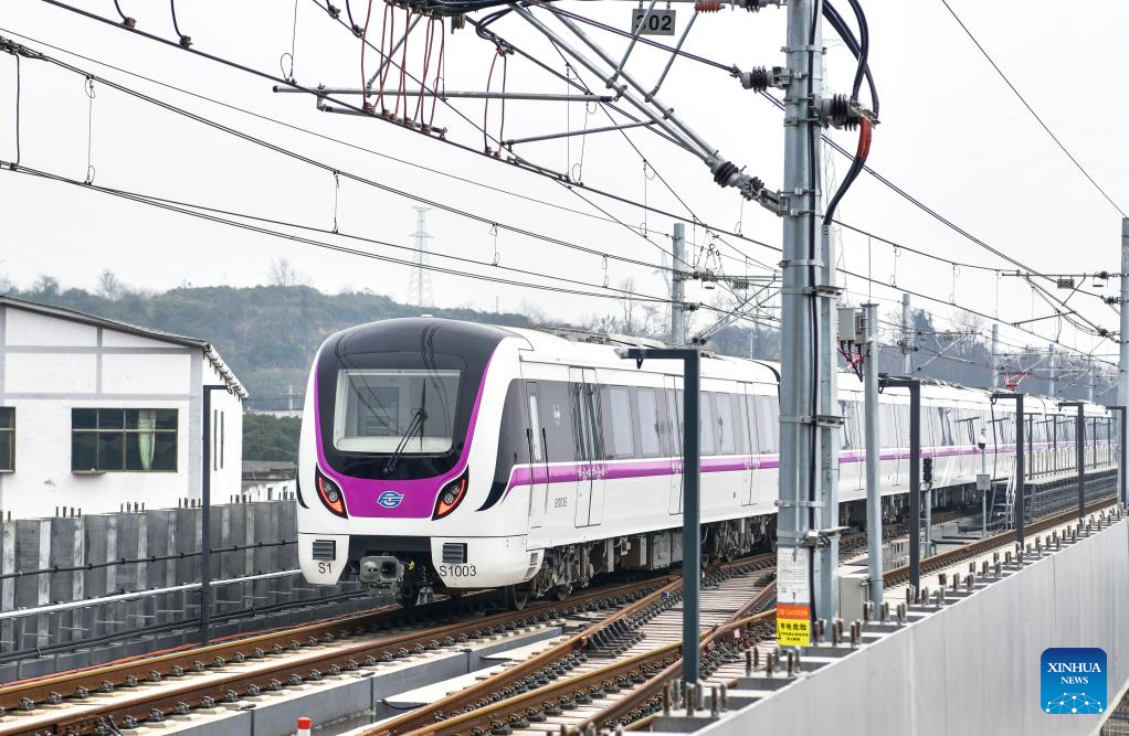 This photo shows a train of S1 line in Guiyang, southwest China's Guizhou Province, Dec. 28, 2024. Guiyang rail S1 line started operation on Saturday. The first phase of S1 line project has a total length of about 30 kilometers and 13 stations, and will become an important passage from Gui'an New Area to the urban area of Guiyang. (Xinhua/Yang Wenbin)