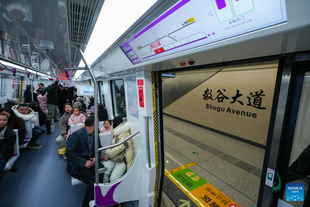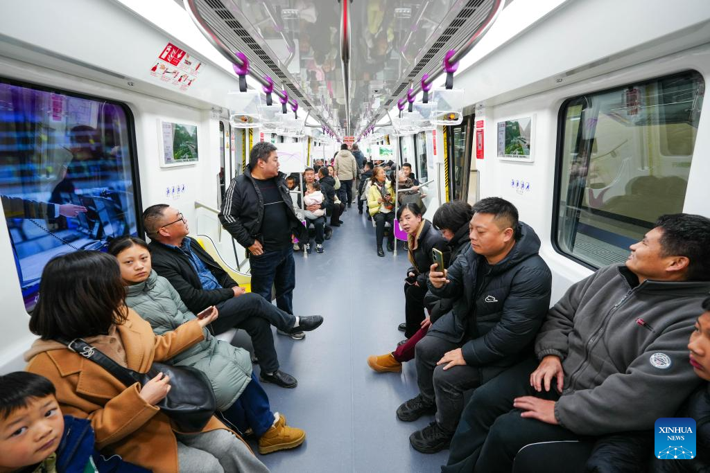 People take a train of S1 line in Guiyang, southwest China's Guizhou Province, Dec. 28, 2024. Guiyang rail S1 line started operation on Saturday. The first phase of S1 line project has a total length of about 30 kilometers and 13 stations, and will become an important passage from Gui'an New Area to the urban area of Guiyang. (Photo by Long Jianrui/Xinhua)