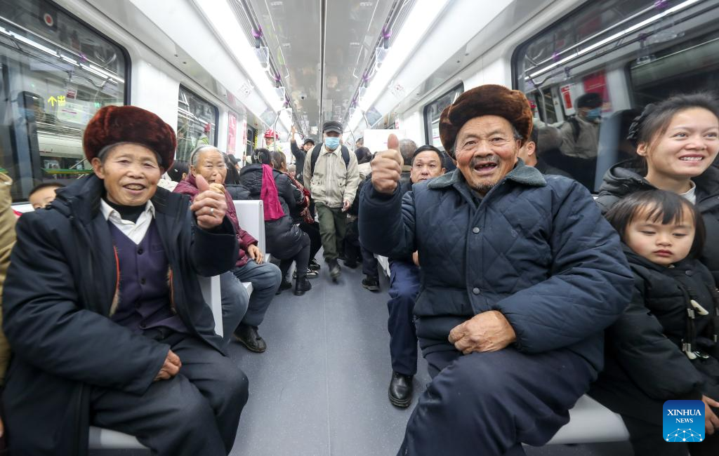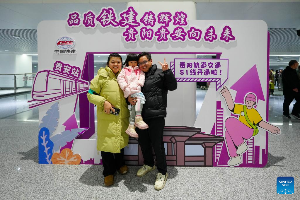 People pose for photos at Gui'an station of S1 line in Guiyang, southwest China's Guizhou Province, Dec. 28, 2024. Guiyang rail S1 line started operation on Saturday. The first phase of S1 line project has a total length of about 30 kilometers and 13 stations, and will become an important passage from Gui'an New Area to the urban area of Guiyang. (Photo by Long Jianrui/Xinhua)