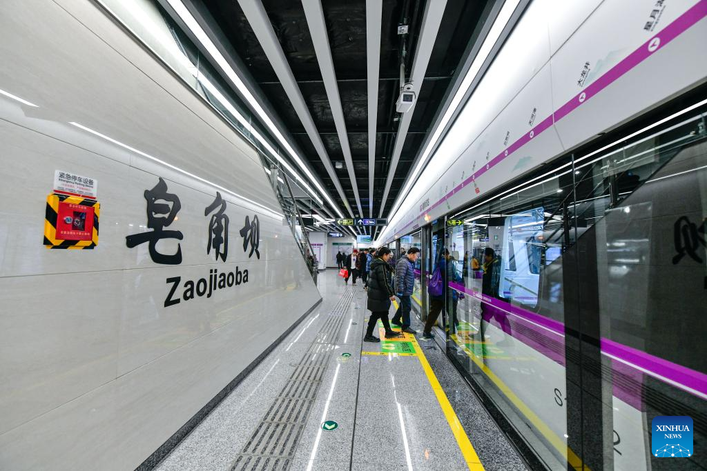 People board a train at Zaojiaoba station of S1 line in Guiyang, southwest China's Guizhou Province, Dec. 28, 2024. Guiyang rail S1 line started operation on Saturday. The first phase of S1 line project has a total length of about 30 kilometers and 13 stations, and will become an important passage from Gui'an New Area to the urban area of Guiyang. (Xinhua/Yang Wenbin)