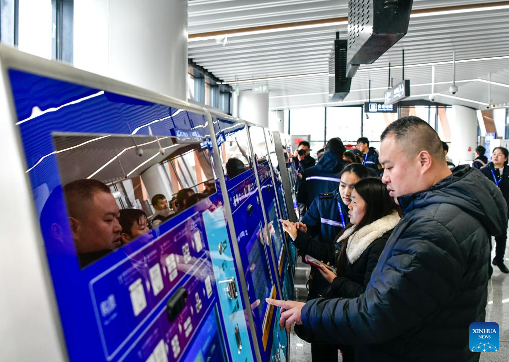 People buy tickets at Tianhetan station of S1 line in Guiyang, southwest China's Guizhou Province, Dec. 28, 2024. Guiyang rail S1 line started operation on Saturday. The first phase of S1 line project has a total length of about 30 kilometers and 13 stations, and will become an important passage from Gui'an New Area to the urban area of Guiyang. (Xinhua/Yang Wenbin)