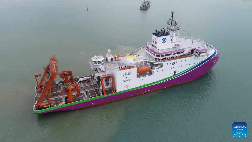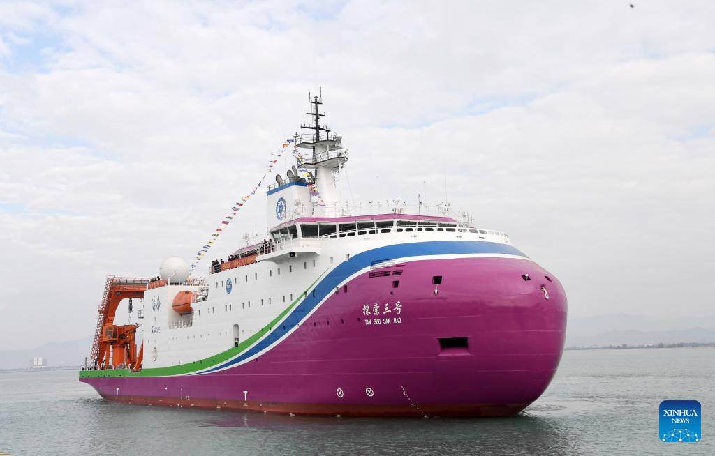 This photo taken on Dec. 29, 2024 shows the multi-purpose deep-sea scientific exploration and archaeological vessel, Tan Suo San Hao, or Exploration No. 3. Tan Suo San Hao on Sunday arrived at a port in Yazhou Bay Science and Technology City in Sanya, south China's Hainan Province, and was officially commissioned here.