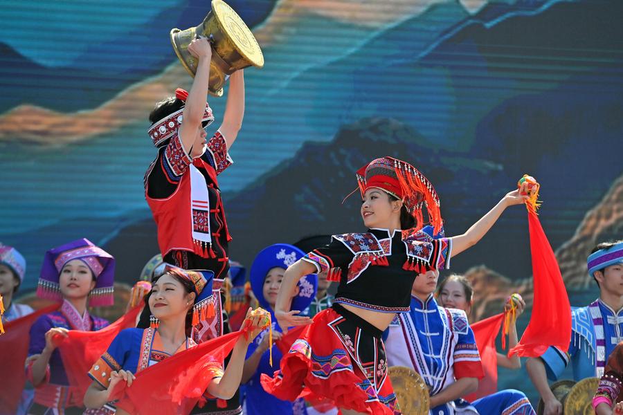People perform folk songs and dances during a cultural tourism carnival in Wuzhou, south China's Guangxi Zhuang Autonomous Region, Nov. 12, 2024. (Xinhua/Huang Xiaobang)