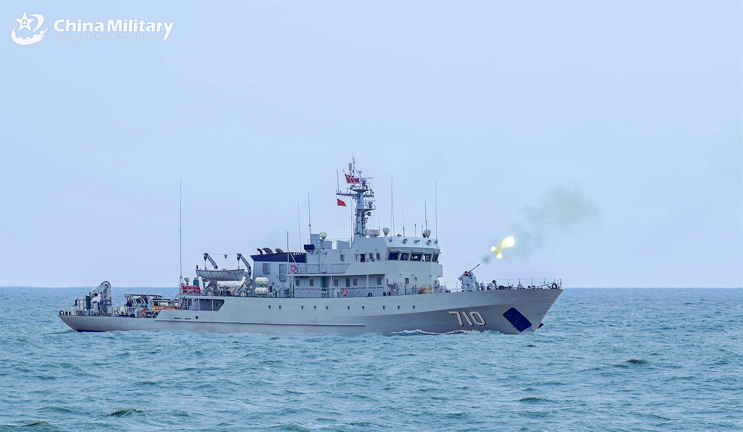 Minesweeper Renhuai (Hull 710) attached to a naval group under the Chinese PLA Navy fires its main gun during a maritime training exercise in late November 2024. (eng.chinamil.com.cn/Photo by Zhang Yi)