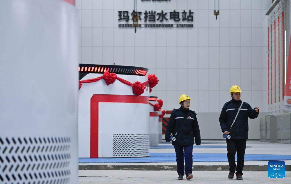Staff members check the operational status of the Maerdang Hydropower Station in Hainan Tibetan Autonomous Prefecture in northwest China's Qinghai Province, Dec. 31, 2024.