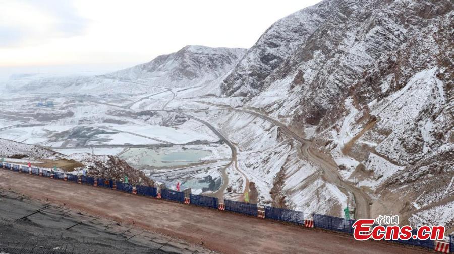 Aerial view of the construction site of the Dashixia Water Control Project in northwest China's Xinjiang Uygur Autonomous Region, Dec. 30, 2024. (China News Service/Wang Xiaojun)