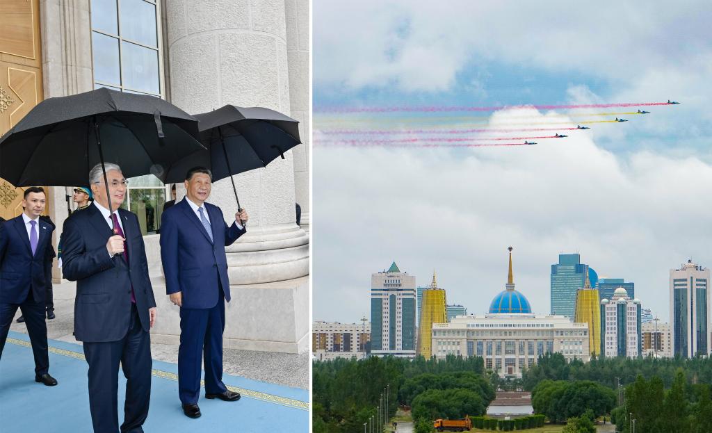 In this combo photo, six Kazakh fighter jets paint the sky with colored smoke trails of red and yellow, colors of the Chinese national flag, while flying over the Kazakh presidential palace to welcome visiting Chinese President Xi Jinping in Astana, Kazakhstan, July 3, 2024. Xi, who was on a state visit to Kazakhstan, held talks with Kazakh President Kassym-Jomart Tokayev at the presidential palace in Astana on July 3, 2024. (Xinhua/Yin Bogu, Wang Jianhua)