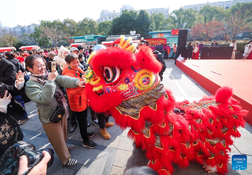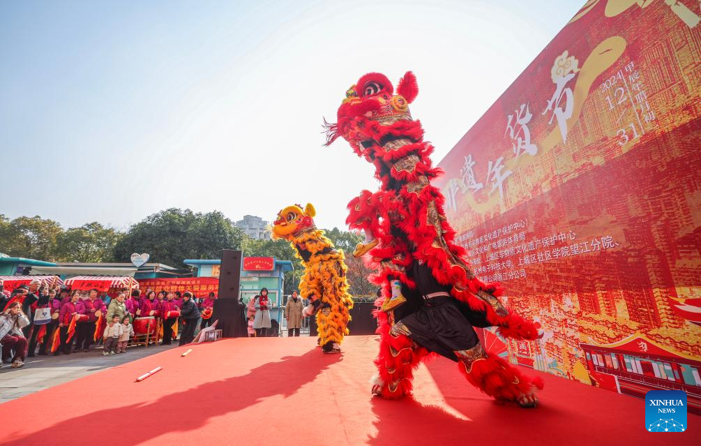 People watch lion dance at a New Year fair in Shangcheng District of Hangzhou, east China's Zhejiang Province, Dec. 31, 2024. The fair opened here on Tuesday, with themed sections showcasing intangible cultural heritage, cultural and creative products, folk custom, and folk arts native to Hangzhou. Specialty food and deli are also made available there, adding a festive atmosphere to the city. (Xinhua/Xu Yu)