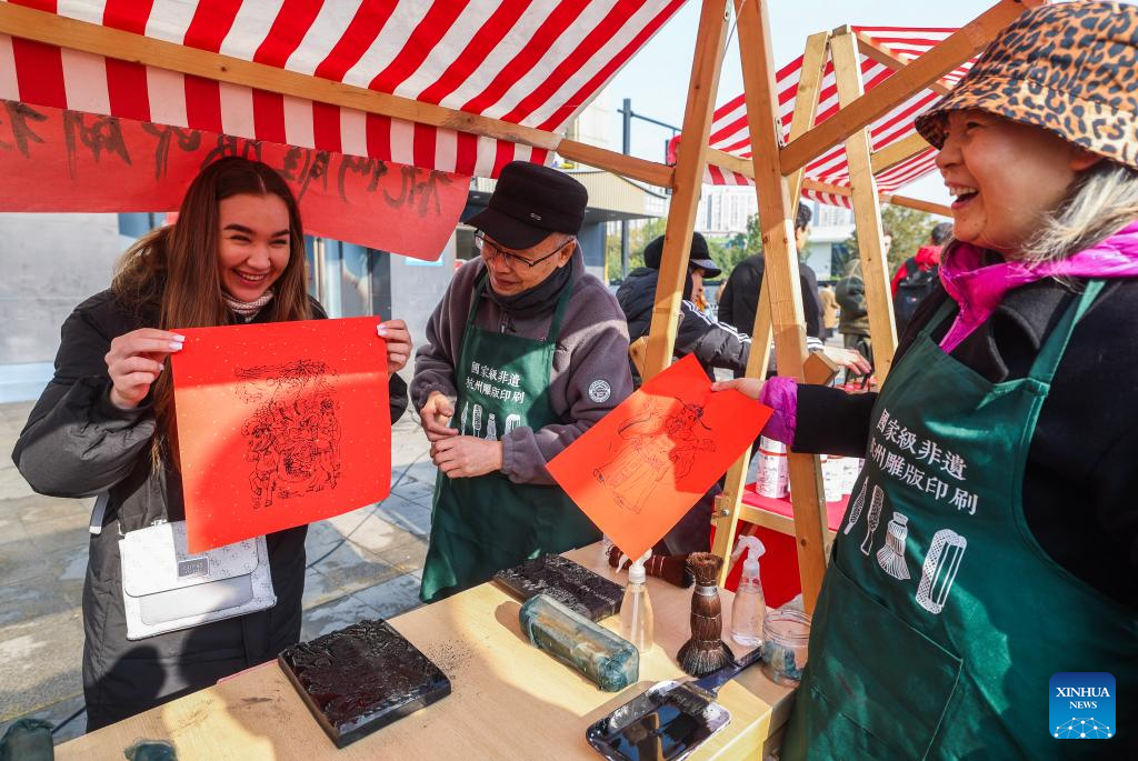 A foreign student (1st L) tries block printing at a New Year fair in Shangcheng District of Hangzhou, east China's Zhejiang Province, Dec. 31, 2024. The fair opened here on Tuesday, with themed sections showcasing intangible cultural heritage, cultural and creative products, folk custom, and folk arts native to Hangzhou. Specialty food and deli are also made available there, adding a festive atmosphere to the city. (Xinhua/Xu Yu)
