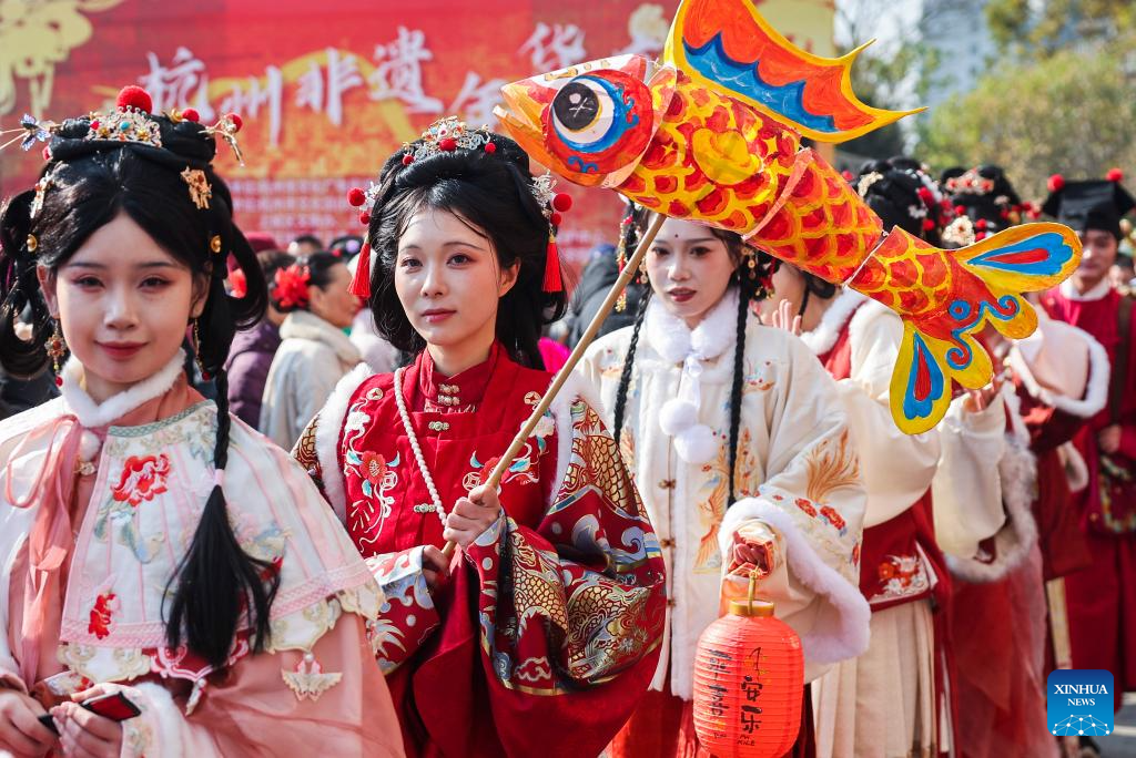 People in traditional Hanfu attire participate in a parade at a New Year fair in Shangcheng District of Hangzhou, east China's Zhejiang Province, Dec. 31, 2024. The fair opened here on Tuesday, with themed sections showcasing intangible cultural heritage, cultural and creative products, folk custom, and folk arts native to Hangzhou. Specialty food and deli are also made available there, adding a festive atmosphere to the city. (Xinhua/Xu Yu)