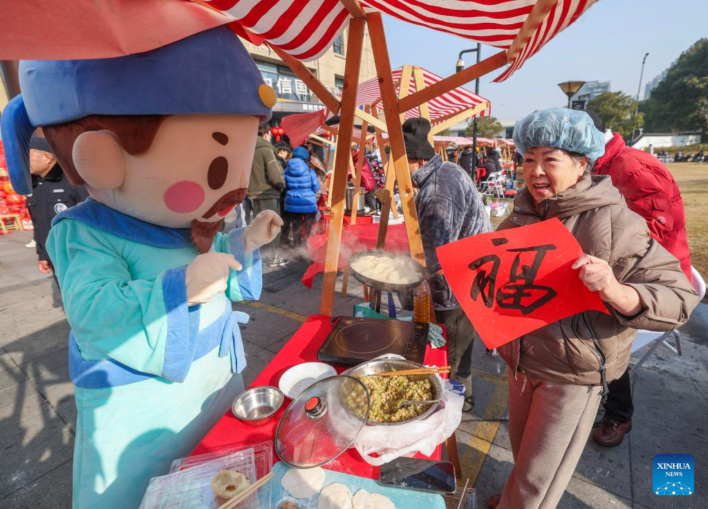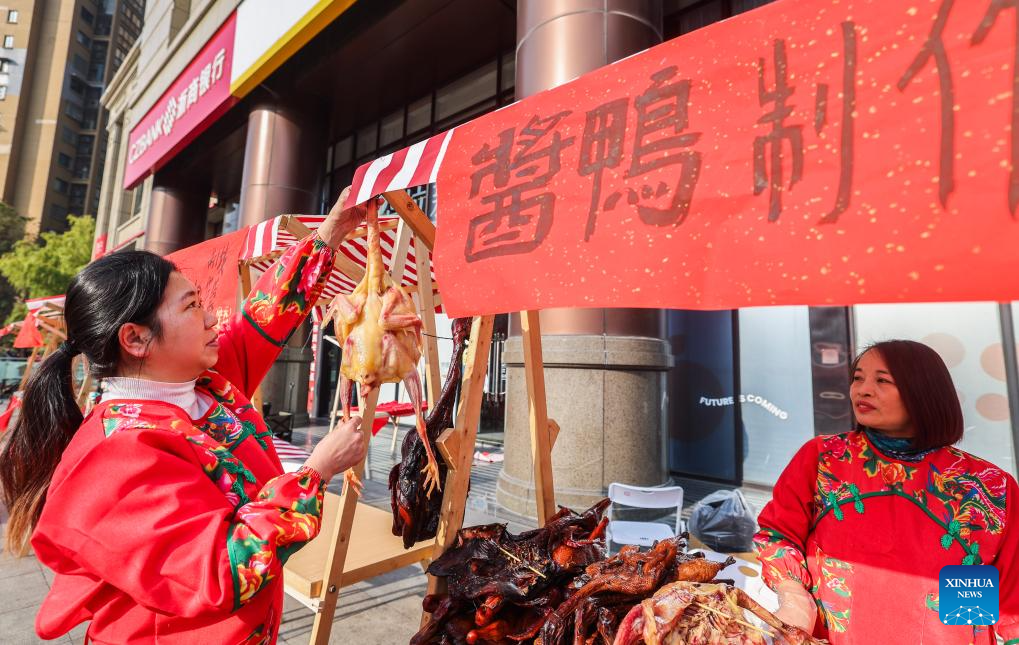 Staff members work at a stall selling traditional food at a New Year fair in Shangcheng District of Hangzhou, east China's Zhejiang Province, Dec. 31, 2024. The fair opened here on Tuesday, with themed sections showcasing intangible cultural heritage, cultural and creative products, folk custom, and folk arts native to Hangzhou. Specialty food and deli are also made available there, adding a festive atmosphere to the city. (Xinhua/Xu Yu)