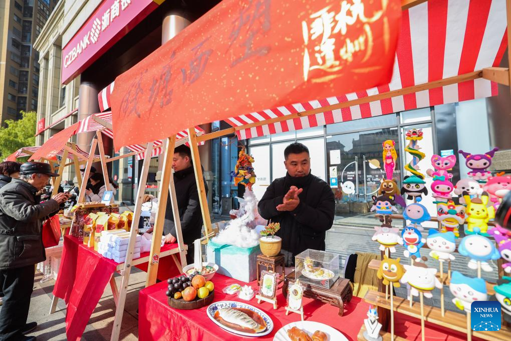 Dough sculpture works are presented at a booth at a New Year fair in Shangcheng District of Hangzhou, east China's Zhejiang Province, Dec. 31, 2024. The fair opened here on Tuesday, with themed sections showcasing intangible cultural heritage, cultural and creative products, folk custom, and folk arts native to Hangzhou. Specialty food and deli are also made available there, adding a festive atmosphere to the city. (Xinhua/Xu Yu)