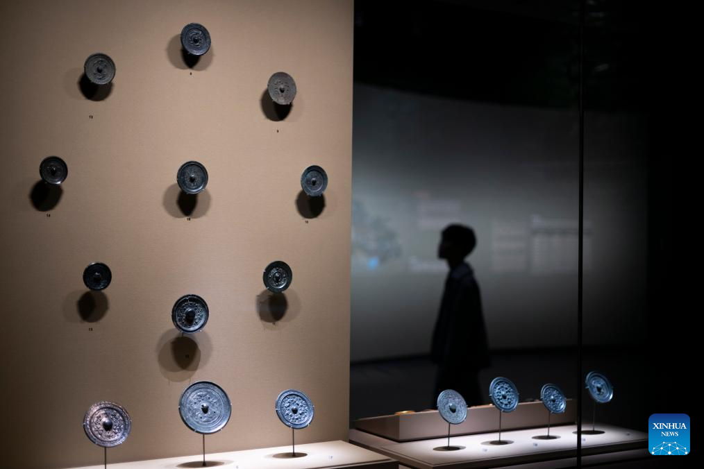 This photo taken on Dec. 31, 2024 shows bronze mirrors on display at the exhibition "A Panorama of Hubei" in Wuhan, central China's Hubei Province. The exhibition opened here on Tuesday, showcasing the history and culture of Hubei in both ancient and modern times. (Xinhua/Wu Zhizun)