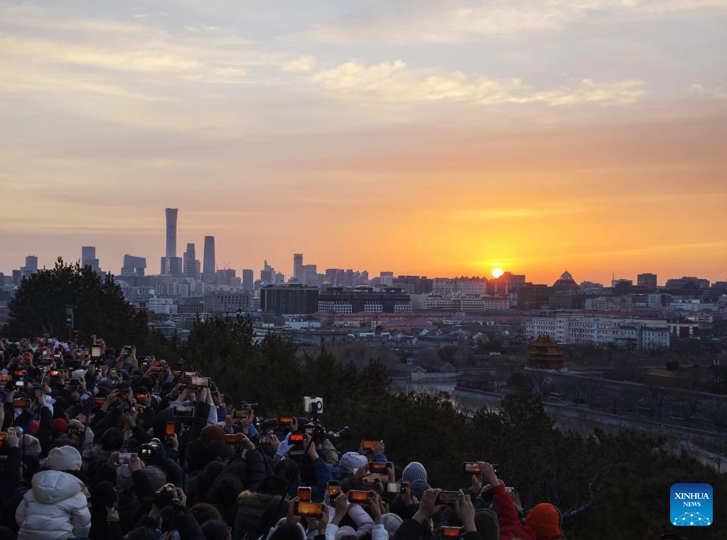 People watch sunrise at Jingshan Park in Beijing, capital of China, Jan. 1, 2025. (Xinhua/Xing Guangli)