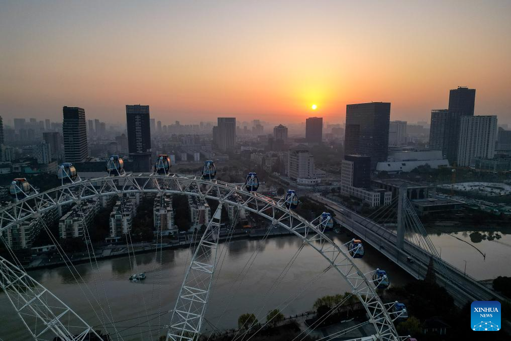 An aerial drone photo taken on Jan. 1, 2025 shows the sunrise scenery as seen in Huzhou City, east China's Zhejiang Province. (Photo by Yi Fan/Xinhua)