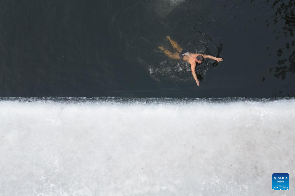 An aerial drone photo taken on Jan. 1, 2025 shows a winter swimming enthusiast swimming in Harbin, northeast China's Heilongjiang Province. People across China enjoy themselves in various activities, celebrating the first day of 2025. (Xinhua/Zhang Tao)