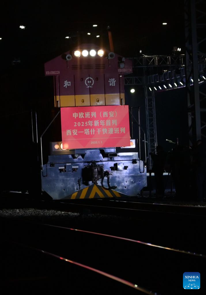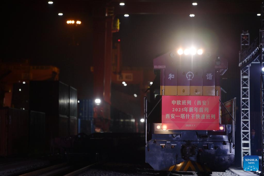 A China-Europe freight train bound for Tashkent, Uzbekistan, departs from Xi'an International Port Station in Xi'an, northwest China's Shaanxi Province, Jan. 1, 2025. Departing early Wednesday morning, the train was the first China-Europe freight train starting its journey from Xi'an in 2025. (Xinhua/Li Yibo)