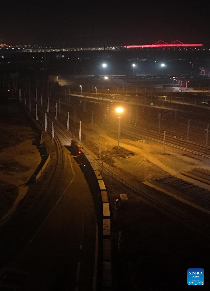 A China-Europe freight train bound for Tashkent, Uzbekistan, awaits departure at Xi'an International Port Station in Xi'an, northwest China's Shaanxi Province, Dec. 31, 2024. Departing early Wednesday morning, the train was the first China-Europe freight train starting its journey from Xi'an in 2025. (Xinhua/Li Yibo)