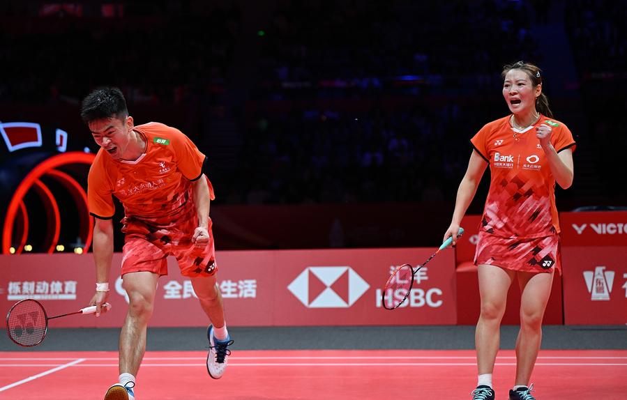 Zheng Siwei (L)/Huang Yaqiong celebrate scoring during the mixed doubles final match between Zheng Siwei/Huang Yaqiong of China and Chen Tang Jie/Toh Ee Wei of Malaysia at BWF World Tour Finals 2024 in Hangzhou, China, Dec. 15, 2024. (Xinhua/Hou Zhaokang)