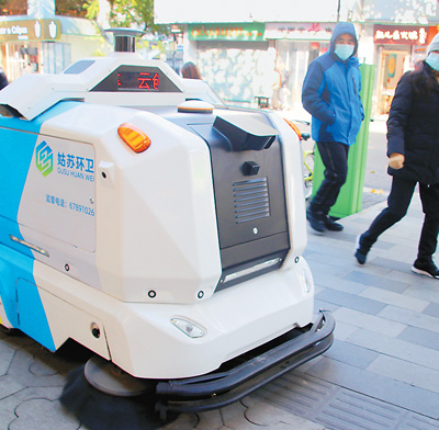 A robot cleans the floor on a street in Gusu district, Suzhou, east China's Jiangsu Province. (Photo/Wang Jiankang)