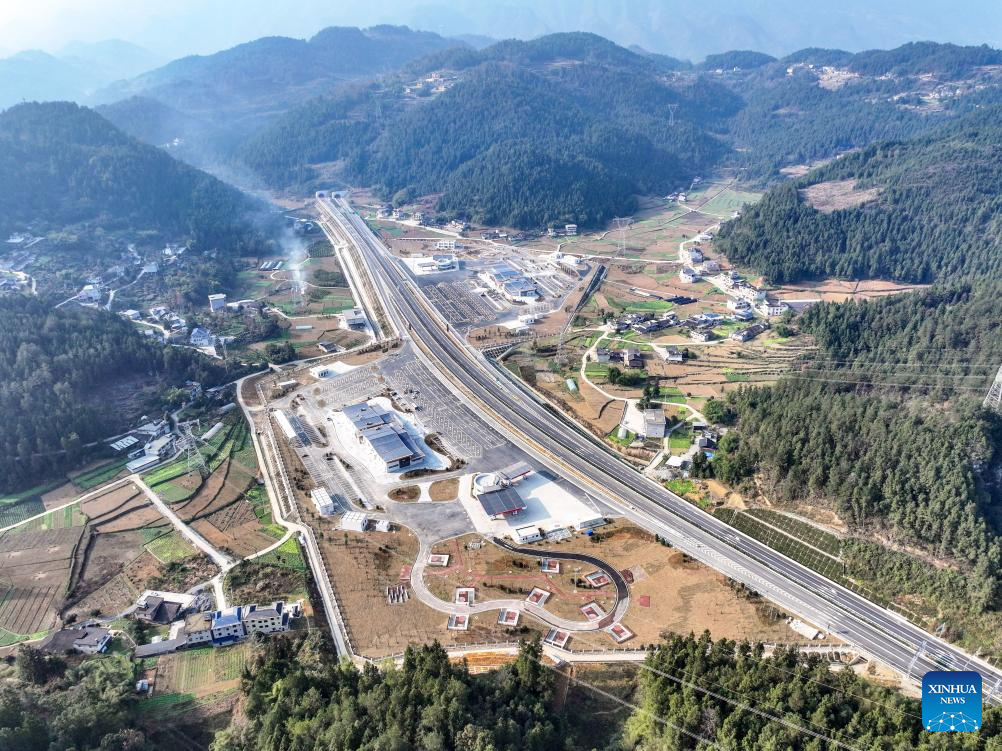 This aerial drone photo taken on Jan. 1, 2025 shows a service area along the second expressway connecting southwest China's Chongqing Municipality and central China's Hunan Province. The second Chongqing-Hunan expressway saw its 127-km Banan-Wulong section and 91.6-km Pengshui-Youyang section, both in Chongqing, opened to public traffic on Thursday. The whole expressway, with a length of 280 kilometers, is expected to put in full operation within 2025. (Xinhua/Tang Yi)