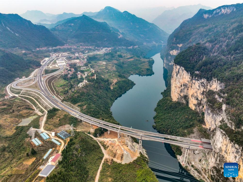 This aerial drone photo taken on Jan. 1, 2025 shows a section of the second expressway connecting southwest China's Chongqing Municipality and central China's Hunan Province. The second Chongqing-Hunan expressway saw its 127-km Banan-Wulong section and 91.6-km Pengshui-Youyang section, both in Chongqing, opened to public traffic on Thursday. The whole expressway, with a length of 280 kilometers, is expected to put in full operation within 2025. (Xinhua/Tang Yi)